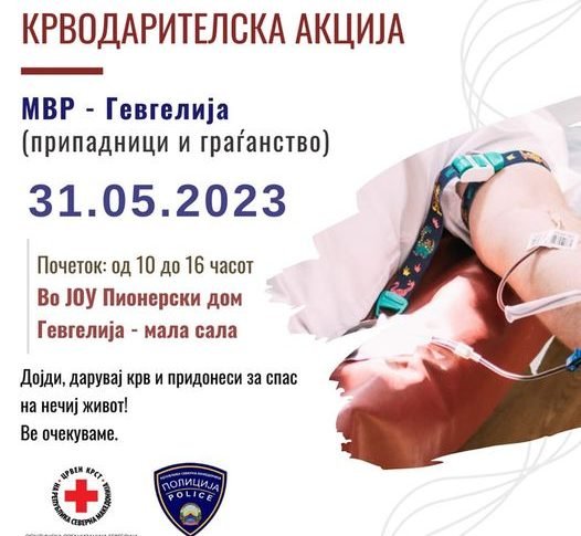 Здравје Општина Гевгелија КРВОДАРИТЕЛСКА АКЦИЈА НА ЦРВЕНИОТ КРСТ ГЕВГЕЛИЈА СО МВР ГЕВГЕЛИЈА И ГРАЃАНИТЕ мај 29, 2023