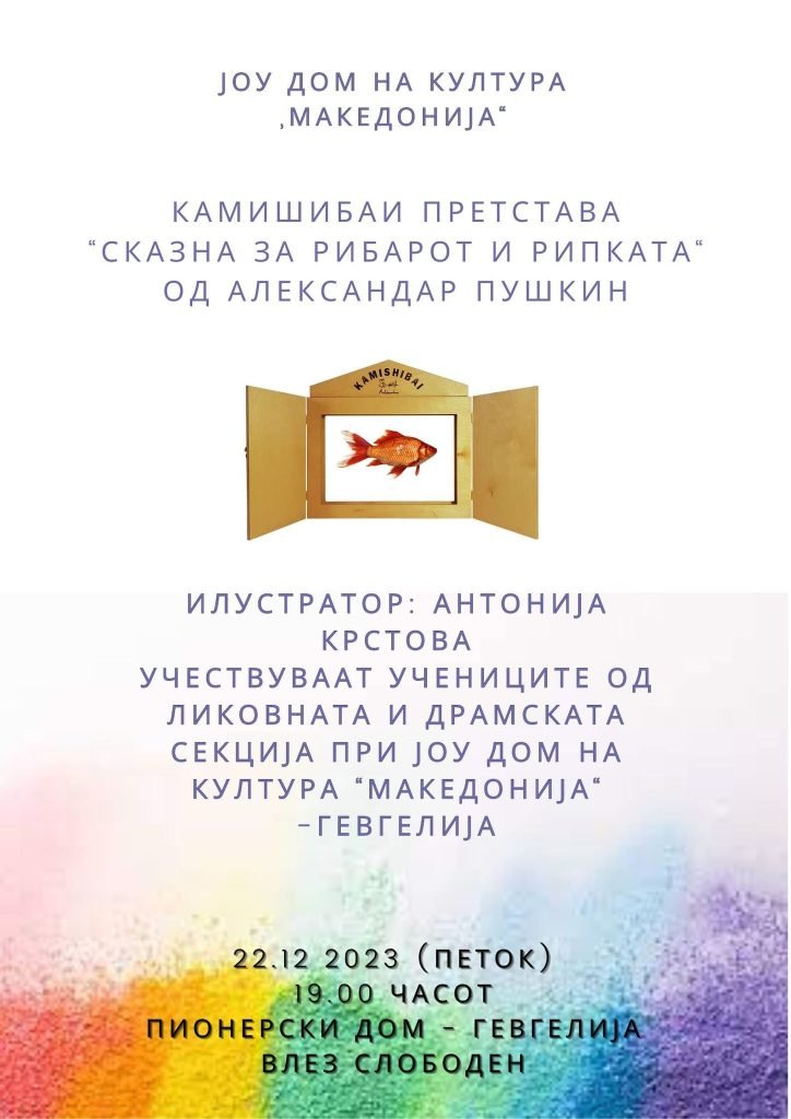 Предновогодишно, членовите на Драмската секција за деца при ЈОУ Дом на култура „Македонија“- Гевгелија, под менторство на Катица Џишева Дупарова, ќе се претстават со камишибаи- претстава „Сказна за рибарот и рипката“ од Александар Пушкин. Претставата ќе се прикаже утре (22.12.2023 г.), во ЈОУ Пионерски дом „Јосип Броз Тито“- Гевгелија, со почеток во 19:00 часот. Влезот е слободен.