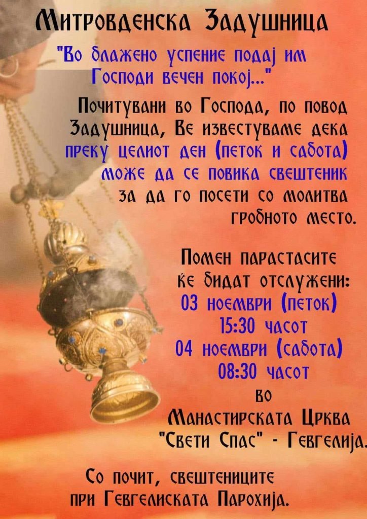 По повод Митровденската задушница, Гевгелиската парохија ќе отслужи помен парастаси во петок, 3 ноември, од 15,30 часот и во сабота, 4 ноември, со почеток од 8,30 часот во Манстирскатта црква „Свети Спас“.