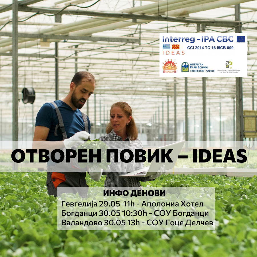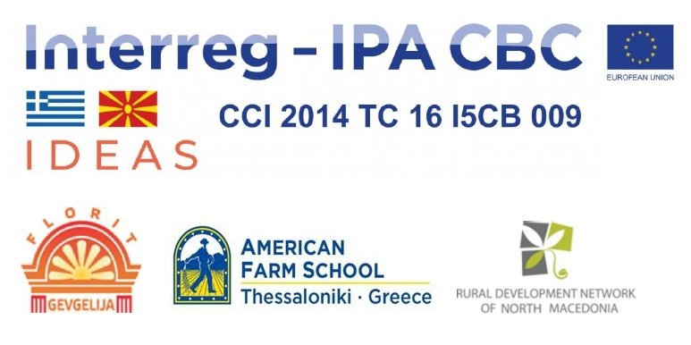 Проектот „IDEAS“ е  дел од   ИНТЕРЕГ ИПА Програмата за прекугранична соработка “Грција –Северна Македонија, за програмскиот период 2014 – 2020” и е финансиран од Европската унија и националните фондови на земјите учеснички, а го спроведува Фондацијата за локален развој и развој на информатички технологии – Гевгелија, во партнерство со Американското земјоделско училиште – Колеџ Перотис од Солун, Грција и Мрежата за рурален развој на РСМ од Скопје.