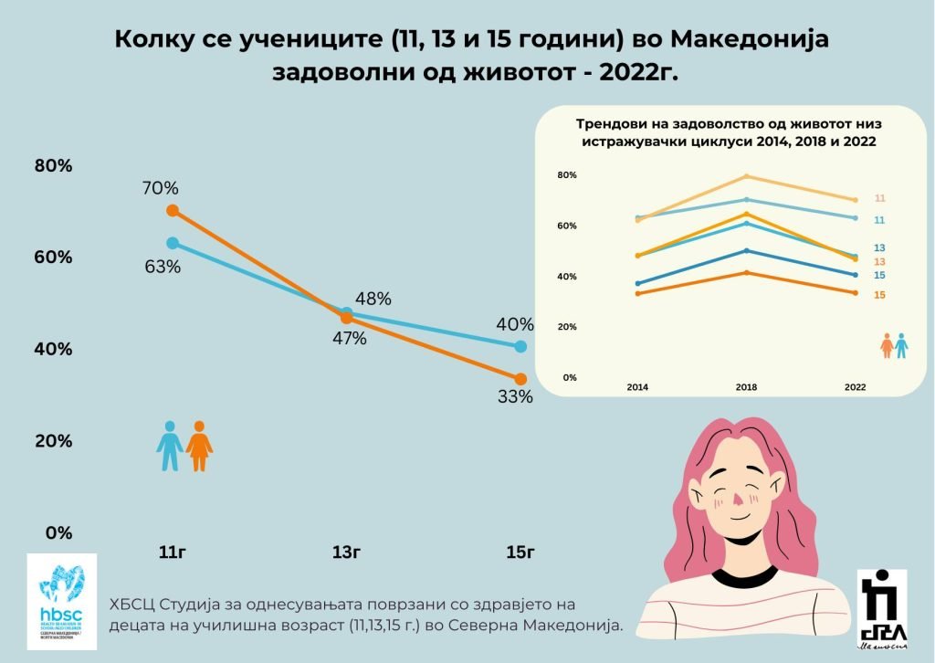 И задоволството од животот опаѓа со возраста од 11 до 15 години, кај девојчињата многу побрзо отколку кај момчињата. Трендот во последните осум години, од 2014 до 2022 година, ја покажува истата насока на меѓуродови и меѓувозрасни разлики, со високи сличности помеѓу 2014 и 2022 година, токму на индикаторите на менталното здравје, што укажува на висока чувствителност на децата на општествените случувања и условите во кои живеат, независно дали се работи за социјална, политичка или здравствена криза и несигурност на заедницата.