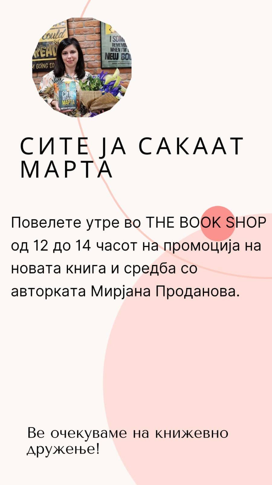 ПРОМОЦИЈА НА КНИГАТА „СИТЕ ЈА САКААТ МАРТА“ ОД МИРЈАНА ПРОДАНОВА ВО КНИЖАРАТА „THE BOOK SHOP“