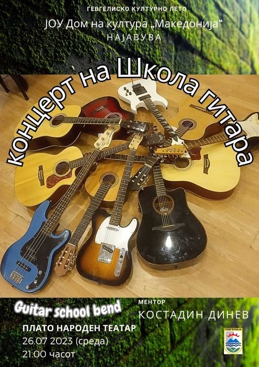 На платото пред Народниот театар – Гевгелија, публиката ќе има можност да ужива во звуците од гитарите на учениците кои ја посетуваат Школата за гитара, под менторство на Костадин Динев, како и на формираниот „Guitar school band“.